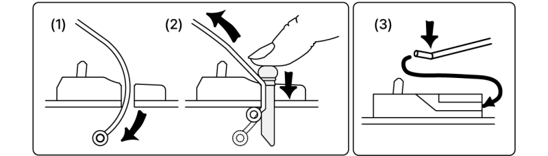이때 브릿지핀을 엄지 손가락으로 누르면서 현의 볼엔드가 걸릴 때까지 현을 당겨 올립니다. (그림2) 그다음 브릿지핀을 단단히 눌러서 자기 위치에 돌아가도록 합니다.