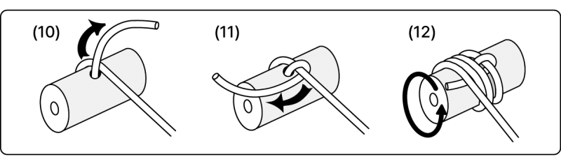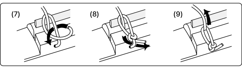 먼저 현을 브릿지 위의 구멍을 통과하고 나서 감아서 묶습니다. 현을 묶는 과정은 그림 7, 8, 9를 참조 바랍니다. 그다음, 현 반대쪽을 튜닝키 기둥의 구멍으로 통과시키고 나서,