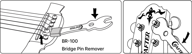 현을 풀 수 있게 브릿지핀을 당겨서 뺍니다.브릿지핀을 뺄 때는 크래프터 브릿지핀 리무버(BR-100)를 사용하면 편리합니다.